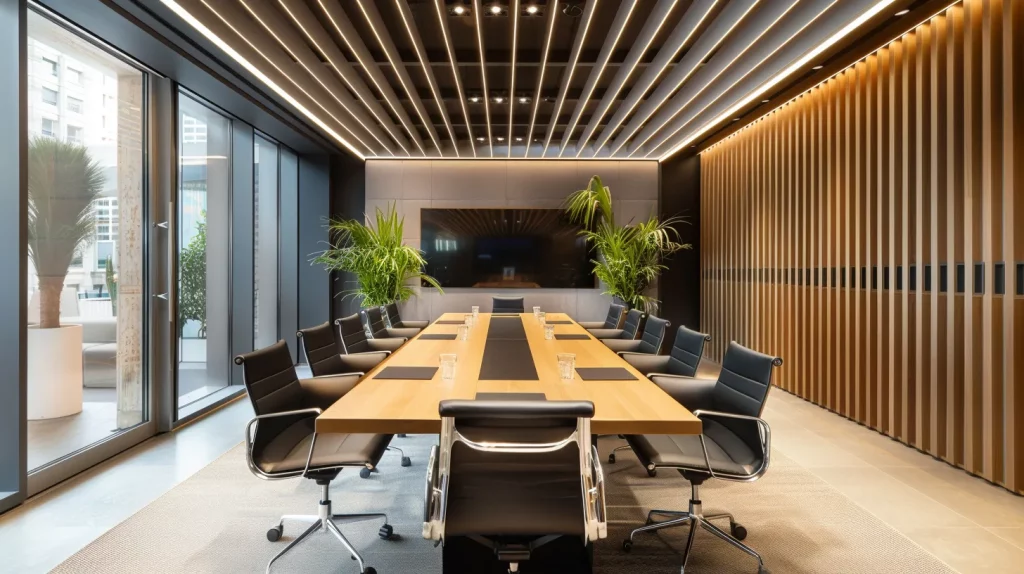 Des salles de réunion conçues pour allier confort, performance et image de marque, en intégrant design, acoustique maîtrisée et usages collaboratifs modernes.
